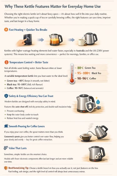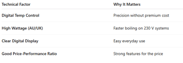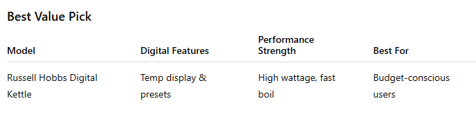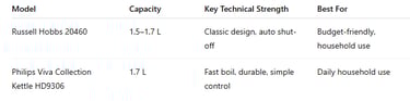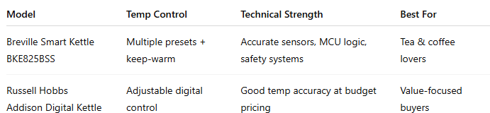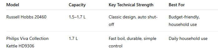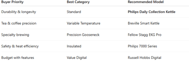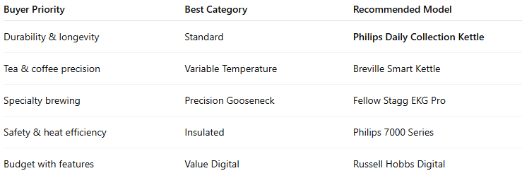 This guide compares the best electric kettles by category, focusing on technical specifications matched to real buyer needs. Whether you want fast boiling, precise temperature control for tea or coffee, enhanced household safety, or maximum value for money, this breakdown helps you choose the right kettle based on how you actually use it.