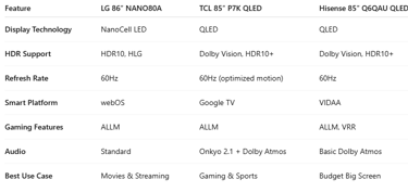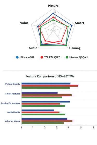 TCL 85″ P7K QLED Google TV — a value-oriented QLED with strong colour performance, smoother motion and robust gaming credentials.