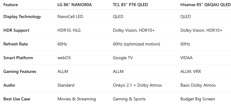 The TCL P7K is the strongest gaming option in this comparison. It supports ALLM, smoother motion handling, and broader HDR gaming formats like Dolby Vision Gaming. Input lag is low, making it well-suited for console gamers and sports fans.